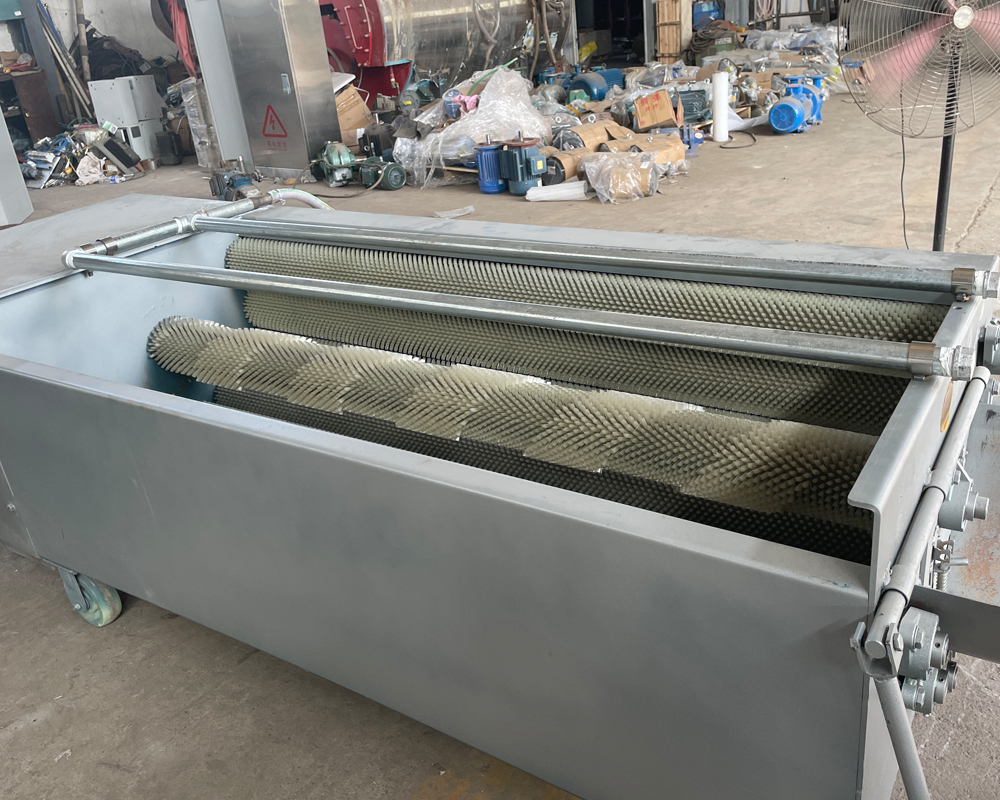 毛刷清洗机适合小型家庭型淀粉客户选购,产能在1-3t/h,毛辊去皮清洗机吸取了薯类加工机械的特点设计制作而成,采用毛刷原理,通过毛刷的转动采用两侧把物料向内侧居中,互相摩擦,毛辊的硬度适中,可以将根茎类清洗干净,该机设有高压喷淋装置,用水冲洗物料,从而达到清洗干净的目的,底端也可设计将清洗的污物通过一个收集盘,将物料流向一个方向,防止污物和污水污染地面,可根据客户的需求设计。主要由电机、变速器、毛辊、电器等组成,广泛适用于马铃薯、红薯、木薯等根薯类的清洗,除皮。该机具有耗能小,体积小,重量轻,外形美观和操作方便的特点。箱体采用优质不锈钢材质,不锈蚀,清洁卫生,毛辊不易变形,毛刷采用熟料尼龙线绳轧制而成,经久耐用。