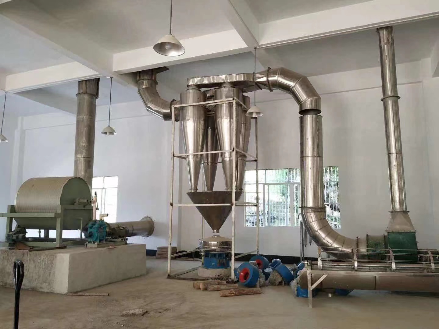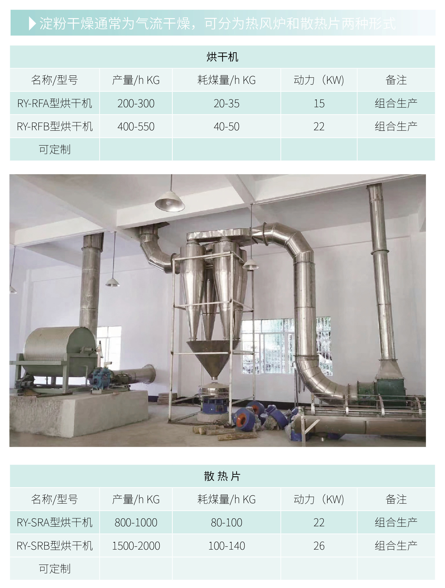 由汝阳古城机械厂生产的淀粉烘干机械。用于淀粉干燥阶段。此组设备自动化程度高,产成品质量好。淀粉干燥过程全在管道中进行,且多为负压操作,因此可以实现自动化,产成品不与外界接触,基本无粉尘、污染小、劳动强度低等优点。